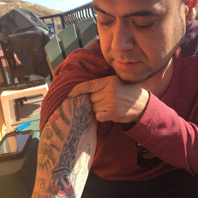 Miguel Pérez looks down at his tattoo of the Statue of Liberty.”I wear the Statue of Liberty that says ‘give me liberty or give me death,’” he said. “Why would I put it in my arm if I didn’t mean it?”WBEZ/Maria Ines Zamudio