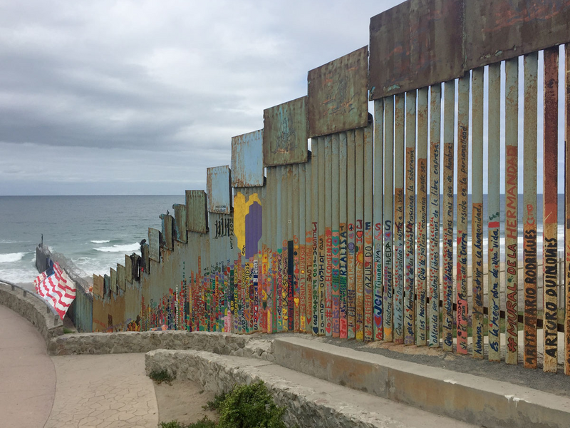 A section of the U.S-Mexico border wall is painted with art and the names of deported U.S. veterans in Tijuana.Maria Ines Zamudio/WBEZ